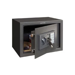 Apertura código y pomo. Llave emergencia tubular. Frente de acero 4 mm. y cuerpo 2 mm. Dos bulones 18 mm. Botón de programación interior. Exterior: 310x200xh200 mm. Interior: 300x190xh150 mm.
