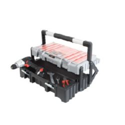 Polipropileno. Cierres metálicos. Asa aluminio con empuñadura de goma. Caja superior con 15 cubiletes removibles para pequeñas piezas. Acoplable a taller móvil 6677 H. 56x30,5x16,5 cm.