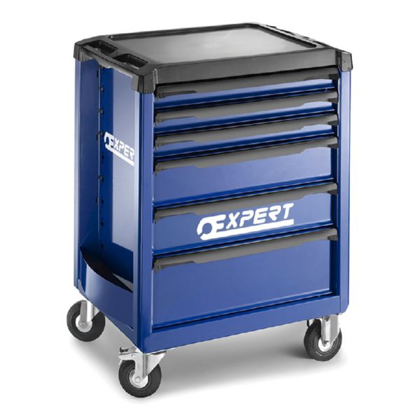 Superficie de trabajo en polipropileno reforzado con fibra. 4 ruedas Ø 125 mm. con freno. 6 cajones con 3 módulos interiores por cajón. 74,8x51,5xh.97 cm.