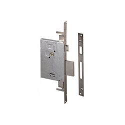 Cuatro vueltas con palanca. Frente y cerradero de acero satinado niquelado. Caja y palanca de acero. Frente de acero inoxidable. Picaporte y palanca niquelados. 1. Entrada 52 mm. Palanca.