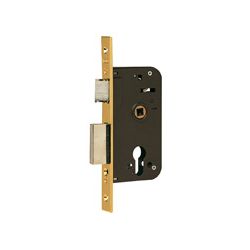 Golpe y llave, reversible. Cilindro perfil europeo. Llave estriada. Entrada 45 mm. Latonado