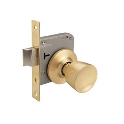 Golpe y llave. Pomo interior reversible. Llaves estriadas. Picaporte palanca en una sola pieza. Latón mate. 80 x 50 mm.
