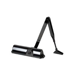 Mecanismo piñon-cremallera con brazo. Fuerza regulable EN 2-3-4. Anchura puertas hasta 110 mm. Puertas hasta 60 kg. Con retenedor. Plata.