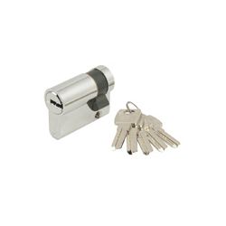 Seis pitones. Excéntrica 15 mm. Protección antitaladro tanto en el tambor como el cañón. Suplementos antiganzúa. Doble embrague. 70 mm. Latón. Descentrado.