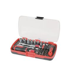 Destornillador telescópico 120-165 mm. mango T con carraca reversible y destornillador telescópico 140-180 mm. mango carrocero con carraca reversible, vasos acero cromo-vanadio y puntas acero S2. 1 mango tipo T 1 mango carrocero 2 portapuntas magnéticos 5x100 mm. 1 adaptador de vasos 15 puntas 9 vasos