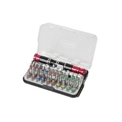Mango portapuntas aluminio anodizado. Con anilla de color para identificar el tipo de punta. Estuche plástico con clip para cinturón. 13 puntas precisión CRV-8660: Plana 1-2-3 mm., Phillips PH 000-00-0, Pozidriv: PZ 0-1, Torx: T 4-6-7-8-9, 10 puntas standar acero S2: Plana 4-6 mm., Phillips PH 1-2, Pozidriv: PZ 1-2, Torx: T 15-25, Allen: 4-6 mm., 1 extensión Ø 4x90 mm., 1 mango portapuntas magnético.