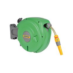 Montaje mural, gira 180º sobre su eje. Permite ajustar la manguera a la longitud deseada y rebobinarla sin esfuerzo. Cierre de seguridad. Incluye conectores, lanza de riego y manguera de alimentación. 10 m.manguera Ø 9 mm.