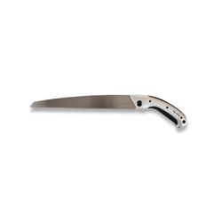 Diente tipo japonés. Mango de aluminio ergonómico antideslizante. Funda protectora reforzada, adaptable a cinturón. Corte limpio y rápido en madera, aglomerado y PVC. Hoja recambio 270 mm.