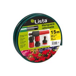 Manguera reforzada tricapa color verde. Conjunto conexiones: racord hembra, 2 conectores y lanza de riego. Ø 15 mm. x 25 m.