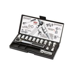 Estuche 14 accesorios. Acero cromo-vanadio acabado satinado. Carraca revesible 72 dientes. Mínimo ángulo de recuperación (5º). Composición: 10 vasos huecos RatioTec: 10-11-12-13-14-15-16-17-18-19 mm., 1 prolongador pasante 76 mm., 1 adaptador a cuadradillo 1/4, 1 adaptador a cuadradillo 3/8, 1 llave carraca pasante RatioTec.