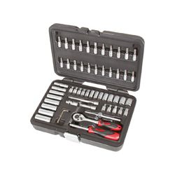 Acero cromo-vanadio satinado. Vasos 1/4 con sistema de bloqueo Locksystem. Incluye 5 vasos perfil tipo E. Composición: 13 Vasos 1/4: 4-14 mm. 8 Vasos serie larga 1/4: 6-13 mm. 5 Vasos perfil E1/4: 4-5-6-7-8 mm. 22 Vasos 1/4 con punta: PH 1-2-3. Plana: 4-5,5-7 mm. Allen:3-4-5-6-7 mm. PZ: 1-2-3. Torx: 8-10-15-20-25-27-30-40. 1 Llave carraca 45T x 1/4. 2 Prolongadores 1/4 x 50 -100 mm. 1 Cardán universal 1/4. 1 Mango deslizante T 1/4 x 110 mm. 1 Mango destornillador vasos 1/4. 3 Llaves allen: 1,5-2-2,5 mm.