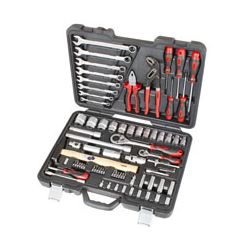 Acero cromo-vanadio satinado. Vasos 1/2 y 1/4 con sistema de bloqueo Locksystem. Composición: 13 Vasos 1/2: 10-32 mm. 9 Vasos 1/4: 4-13 mm. 4 Vasos serie larga: 8-10-12-13 mm. 18 Puntas atornillador 1/4 x 25 mm. 2 Llaves carraca 45T x 1/2 - 1/4. 2 Llaves de bujía 1/2 x 16-21 mm. 1 Cabezal deslizante mango T 1/2. 2 Caedán universal 1/2 - 1/4. 2 Prolongador 1/2 x 125-250 mm. 1 Prolongador 1/4 x 75 nmm. 1 Mango deslizante T 1/4 x 110 mm. 1 Mango para vasos 1/4. 1 Prologador flexible 145 mm. 1 Adaptador de puntas1/4. 3 Llaves allen: 1,5-2-2,5 mm. 8 Llaves combinadas: 8-19 mm. 5 Destornilladores boca Plana/Phillips. 1 Martillo 300 gr. 1 Alicate pico loro 250 mm. 1 Alicate universal 180 mm.