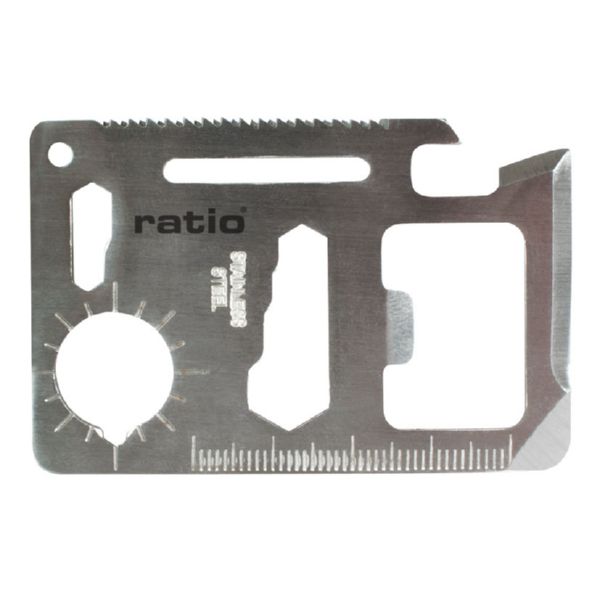 Acero inox. Formato tarjeta de crédito ideal para actividades al aire libre, caza, camping, etc. Funda de transporte. 15 funciones.\r\nDimensiones: 69x45 mm\r\n