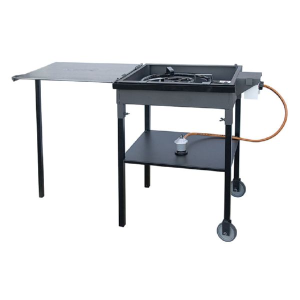 Estructura de acero. Plancha superior convertible en mesa lateral. Incluye paellero Ø 40 cm, tubo regulador de gas. 77x53xh.90 cm.