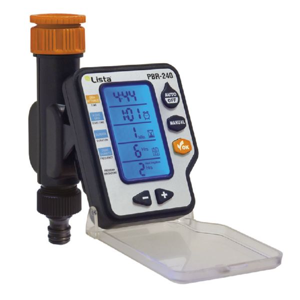 Fácil programación en 3 pasos. Duración riego: 1-240 min. Frecuencia riego: 1-15 días.