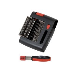 Estuche 27 accesorios. Puntas atornillado y mando adaptador compacto. Puntas acero cromo-vanadio S2. Clip para cinturón. 26 puntas 1/4 x 25 mm: Planas: 3-4-5-6-7 mm. Phlillips: Nº 1-2-2-2-3 Pozidiriv: Nº 1-2-2-2-3 Torx: T10-15-20-25-30 Allen: 2-2,5-3-4-5-6 mm. Mango destornillador de ajuste rápido.