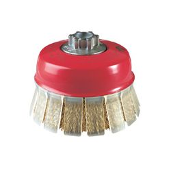 Acero latonado ondulado Ø 0,3 mm. Guarda protectora. Casquillo roscado M14. Máx 8.500 rpm. Ø 100 mm.